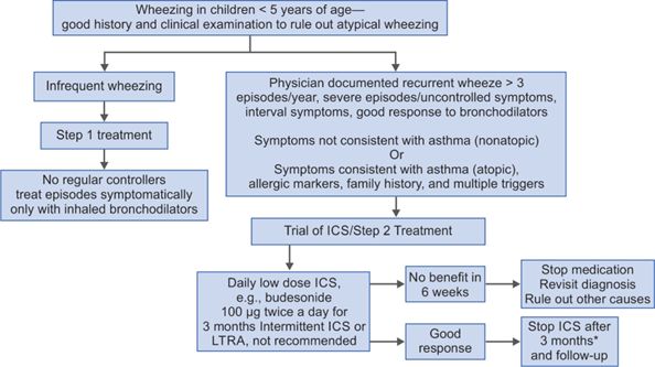 *In children with severe episode/life-threatening exacerbation in the past, it is important to continue inhaled corticosteroid (ICS) for a longer period at a minimum dose that can prevent further exacerbation with periodic monitoring until the child outgrows the symptoms. If no risk factors for exacerbation are present, ICS should be stopped and child followed up for symptom recurrence. ICS can be restarted if symptoms recur.