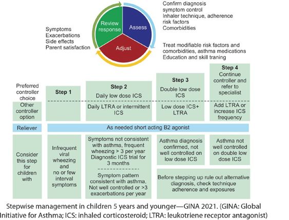 If child is not well-controlled on this double low dose regime after removing all modifiable risk factors, treatment can be stepped up to step 4. However, such a child should be referred to asthma specialist for further management.